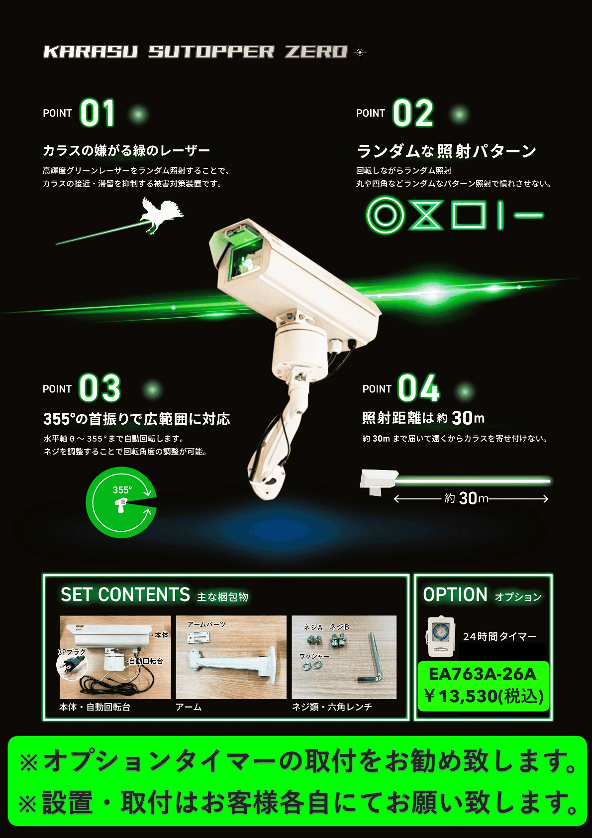 ■限定20台!■ 「カラス被害をゼロに」 カラスストッパーZERO 発売 2026.03.18 #新商品 カラスの嫌がる緑色のレーザーで「カラス被害」をゼロに! 限定20台 ¥220,000(税込) (設置・取付はお客様にてお願いします) ※オプションの24時間タイマー【EA763A-26A ¥13,530(税込)】の取付をおススメします。 お気軽に各購買窓口までお問合せ下さい(^^♪ 記事一覧に戻る